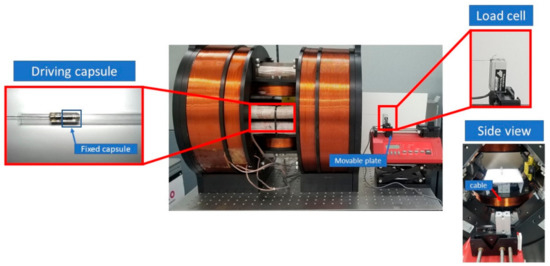 The proposed modular capsule’s motion is designed to be actively controlled for the locomotion and transport of functional modules. Therefore, we measured the propulsion force of the modular capsules driven by the EMA system to verify the feasibility of this kind of propulsion system. Figure 8 presents the configurations and experimental setup for measuring the driving capsule’s and the functional capsule’s propulsion force separately. A load cell (Transducer Techniques, Temecula, CA, USA) was set up and individually connected to the driving capsule and functional capsule via a cable. The modular capsule was placed inside a glass tube and put in the ROI of the EMA system. The propulsion forces were measured with the magnetic gradient field and the magnetic flux density, at various levels.