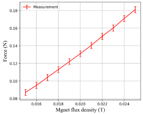 When the EMA system drives the modular capsules, the functional capsule does not completely rely on the traction of the driving capsule. The soft magnet in the functional capsule can also provide a certain driving force, so the required attraction force should be bigger than gastrointestinal tract resistance minus the driving force provided by the functional capsule. Figure 10 shows the experimental setup for measuring the attraction force between the driving capsule and the functional capsule. Since there is no need to move the capsules, only uniform magnetic fluxes of varying strengths from 15 mT to 25 mT are applied to measure the attraction force between modular capsules. As shown in Figure 11, the measured attraction force is proportional to the strength of the magnetic flux density, and the maximum attraction force was approximately 0.18 N at a magnetic flux density of 25 mT. This is sufficiently large to overcome the resistance in the digestive tract, indicating the feasibility of assembly and transport of our modular capsule system.