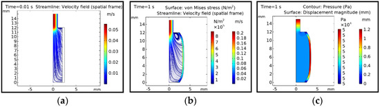Figure 2 shows the simulation result of the coupled 2D FSI problem. The velocity profile at t = 0.01 s is shown in Figure 2a, in which no deformation of the body can be observed. Figure 2b,c shows the results at t = 1 s, in which an air pressure of 0.5 bar is applied. There was a significant deformation in the solid domain, and the corresponding velocity and stress contours as well as pressure and deformation contours were plotted. This simple 2D study shows the principle of FSI simulation.