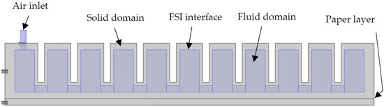 The geometry of the PneuNets bending actuator was imported in COMSOL Multiphysics and modified for the suitability of FSI modelling. The fluid domain inside the actuator was created, and the inlet air supply tube of 2 mm diameter was included in the geometry. The modified PneuNets actuator is shown in Figure 3. It was fixed at the left and top faces of the first chamber. The fluid flow was assumed as incompressible and laminar. Gravity was also taken into account. The model was initially simulated only for gravity using Study Step 1. Once the steady state was reached, the air pressure was gradually applied to the actuator in Study Step 2. The interaction between the chambers upon inflation was taken into account using contact modelling. The paper layer was modelled as a thin elastic layer. The complete modelling procedure is described in detail in Appendix A.