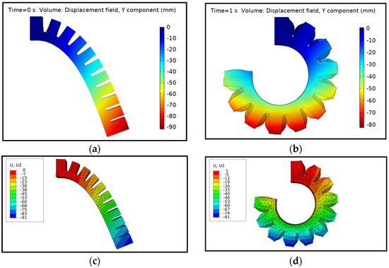 Deformation comparison of the PneuNets bending actuator from the FSI and FEM simulation models: (a) Initial deformation from the FSI model due to gravity at 0 kPa pressure; (b) Final deformation from the FSI model at 50 kPa pressure; (c) Initial deformation from the FEM model due to gravity at 0 kPa pressure; (d) Final deformation from the FEM model at 50 kPa pressure.