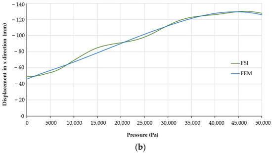 Comparison of the displacement path measured at the actuator tip from the FSI and FEM simulation models: (a) Pressure vs. displacement in y direction; (b) Pressure vs. displacement in x direction.