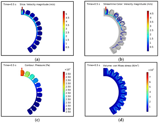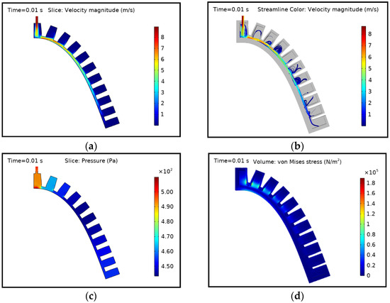 The behaviour of the actuator at the initial time step of 0.01 s is shown in Figure 6. The fluid velocity was higher at the inlet and it propagated until the last chamber of the actuator. The velocity decreased as it reached the last internal chamber, where almost no fluid velocity is present, as seen in (a). The trend was followed by preceding chambers. The middle chambers were not yet fully filled with fluid, as seen in the streamlines in (b). The applied fluid pressure at the inlet at this point was 500 Pa, and the pressure dropped in subsequent chambers. Figure 6c shows that the middle chambers experience a low pressure of nearly 450 Pa as the fluid propagates to the last chamber. The maximum pressure and stress appear in the first chamber since it is in direct contact with the inlet fluid supply hose. Hence, the adjacent walls and surfaces should be designed in such a way that they withstand higher pressures and stresses.