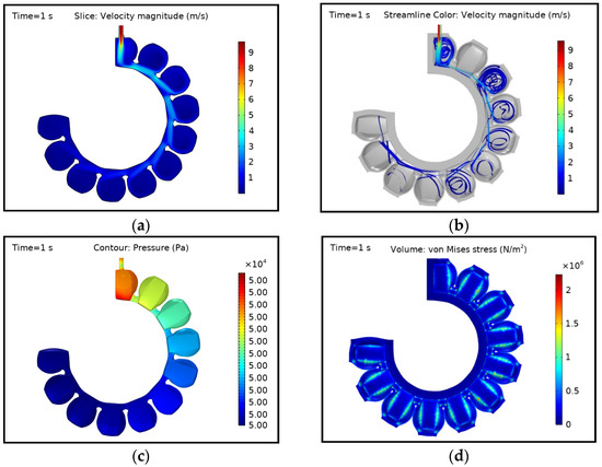 The edges and corners of the flow channels are subjected to more stress. Since pressure energy is consistently supplied into the actuator, which is a closed system, the fluid properties change at different points. The results of the final time step with 50 kPa fluid pressure are shown in Figure 8. The average fluid velocity was relatively higher than the initial state due to more control volume in the actuator, which favours the flow predominantly in the first chamber and flow channels. Similar to the conditions at the middle time step, the streamlines were not observed anymore in the further channels, and the applied pressure of 50 kPa was distributed everywhere inside the domain.