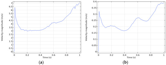 Average velocity plot for the complete simulation: (a) Velocity plot at the inlet boundary; (b) Velocity plot for the whole fluid domain.