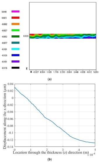 At the first step, the piezoelectric shear constant was evaluated in single and stack actuator configurations in order to obtain its original value at high applied voltages prior to integration in the composite structure. Stack design was selected for the piezoelectric stack actuator since it produces enhanced displacements that can be more accurately measured by the ESPI system depending on the number of layers and applied voltage. Since the shear-induced length (x-direction) displacements of the stack actuators at low applied voltages were not detected well by the ESPI system, measurements were performed at 199 V as the highest limiting voltage. The detected x displacements of the single, two-stack, and four-stack actuators under an applied voltage of 199 V (3.98 kV/cm) are presented in Figure 4.