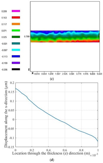 The surface distribution of the transverse shear deflection of the finite element simulation considering the nonlinearity and ESPI measurement at an applied voltage of 198 V are presented in Figure 10a,b.