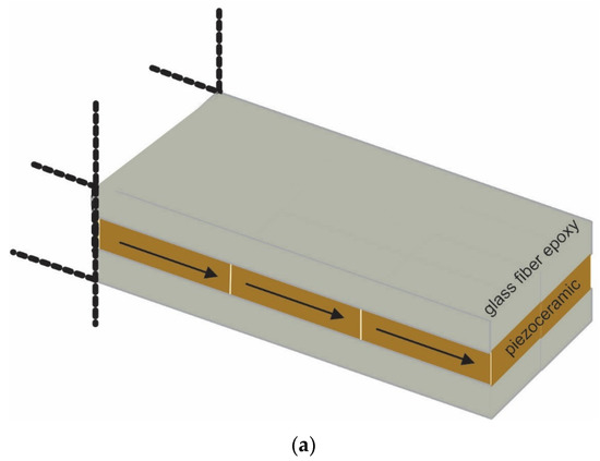 To investigate the piezoelectric shear response under static electric field, an ESPI system (Dantec-Ettemeyer ESPI Q300) with in-plane and out-of-plane measurement configurations was used (Figure 1). The two-stack and four-stack piezoceramic benchmarks were constructed according to the design presented in Figure 2. Soft piezoceramic PIC255 shear patches of dimensions 25 × 25 × 0.5 mm3 were supplied from PI (Munich, Germany). The material properties of the piezoceramic material are provided in Table A1, Appendix A. The outer surfaces of the shear patches are covered with thin-film Au electrodes.