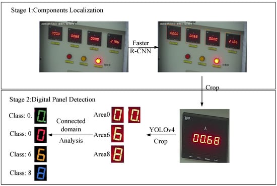 In view of the problems that the decimal point of digital instrument in the actual scene of substation is prone to false detection and leak detection, and the accuracy of number identification is not high. The paper innovatively combines Faster R-CNN [13,14,15] and YOLOv4 [16] target detection algorithms with connected domain analysis methods. A target detector was formed, and experiments were carried out on the image data actually collected by the substation and compared with the detector composed of Faster R-CNN and YOLOv4. Using Faster R-CNN positioning [17] accuracy, YOLOv4 accuracy and real-time balance characteristics. This algorithm can remove the interference information in the image data, judge the number category and determines whether the decimal point is included by analyzing the attributes of the connected domain [18,19] in the image results. Experiments show that the detector combined with the connected domain analysis method can effectively solve the problem of mutual interference between categories in the neural network, therefore improving the detection performance.
