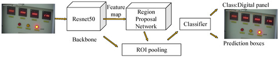 In 2015, Kaiming He [13] and others proposed the Faster R-CNN algorithm. So far, this method is still one of the most accurate algorithms [23], using a small RPN (Region Proposal Network) to generate the candidates area. The method improves the processing speed of the image. Digital region, as a key component, can be localized to effectively reduce the influence of background [24] and reduce the scale of target detection and search [15]. In order to ensure the accuracy of the positioning area, the Faster R-CNN network is used to locate the required digital meter area. The image is input into the feature extraction network [25] to obtain the feature map. The paper uses Resnet50 [25] as the backbone, and uses the RPN structure to generate candidate frames, and the candidate frames generated by RPN Projected to the feature map to obtain the feature matrix, each feature matrix is scaled to a 7 × 7 size feature map through the ROI (Region of interest) pooling layer, and the feature map is flattened and the prediction result is obtained through the fully connected layer [26]. Faster R-CNN regional positioning is shown in Figure 2.