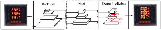At present, there are detection algorithms for instrument detection, such as template matching method, threading method, five-segment feature extraction method, and image recognition method based on deep learning [5,6,7,8,9]. The template matching method establishes the template of each number from 0 to 9. Then the algorithm denoises the digital image and the template image, binarization and normalization into the same size difference, and takes the number with the smallest difference as the corresponding number. The process is simple, but different templates need to be designed for different numbers, and the robustness is poor. The threading method determines the number by equally dividing the area of the digital dial and scanning the form of pixels. This method is not suitable for dials with decimal points and is subject to environmental interference factors. Huang et al. [10] proposed a digital meter readings recognition algorithm based on a sample matching algorithm. This algorithm is simple and easy to implement. However, in the complex environment of substation instruments, it is necessary to construct a sample with the same image and stable structure. The robustness of this method is poor, so it is difficult to meet the needs of the project. Chen et al. [11] proposed an algorithm for rapid recognition of digital meters based on feature detection. Based on the seven-segment feature extraction method for digital tube, the algorithm adds intersecting lines to detect special positions and determine specific numbers. This method can determine whether there is a decimal point, but it needs an appropriate shooting angle, and there is a high false detection rate in the actual scene of the substation. Liu et al. [12] used the deep learning CNN (Convolutional Neural Network) model to operate on the entire line of text. The accuracy is higher in the synthetic data set, but the accuracy rate drops significantly in the real scene. The main reason is that the synthetic sample has a gap with the real object.