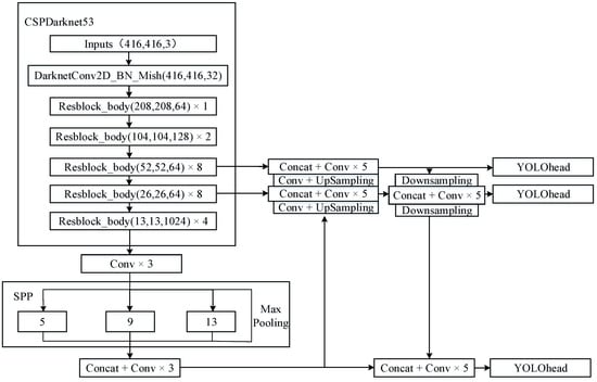 YOLO is a classification algorithm that uses regression networks to achieve target detection. Compared with the traditional network based on area candidates, the YOLO network directly uses the target detection task as a regression task to ensure the detection speed and ensure the real-time detection [28,29]. The YOLOv4 detection network introduced the architecture of CSP (Cross-Stage-Partial-Connections) [16], built CSPDarknet53 [8] as the backbone feature extraction network, and pooled the output of CSPDarknet53 through the SPP (Spatial Pyramid Pooling) [30,31]. The method enhances the receptive field of the network. As an additional module of Neck, SPP uses multi-scale pooling to effectively improve the detection accuracy of the training model, and uses a series of up-sampling and down-sampling of PANet (Path Aggregation Network) to fuse the features of each target scale. Compared with YOLO [32,33,34], YOLOv2 [35], YOLOv3 [36,37], YOLOv4 greatly improves the detection accuracy of the model while ensuring speed, and has the highest accuracy among all current real-time target detection algorithms [38], the map on the coco dataset is 43.5%. YOLOv4 network structure is shown in Figure 4.