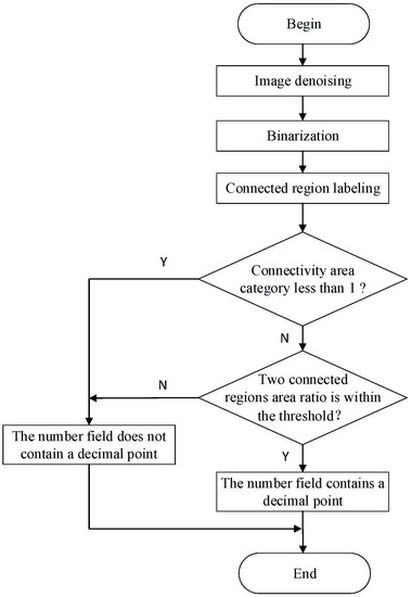 After marking the connected domain, the category and size of the connected domain are analyzed and the number of categories of each connected domain is calculated. Then the area of the connected domain is calculated in pixels. Finally, the number of categories and the area of the connected domain are used to judge whether the decimal point is included. The specific judgment strategy is: if the number of categories is 1, it is judged that the number area does not contain a decimal point. When the area of two or more connected domains is divided, if it is greater than a certain threshold value, it is judged that there is a decimal point in the digital region. If less than the threshold, the numeric region does not contain a decimal point. The algorithm flow chart of digital region connectivity domain is shown in Figure 5.