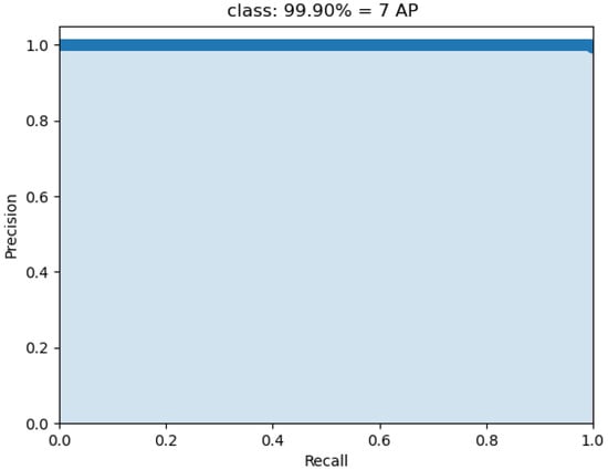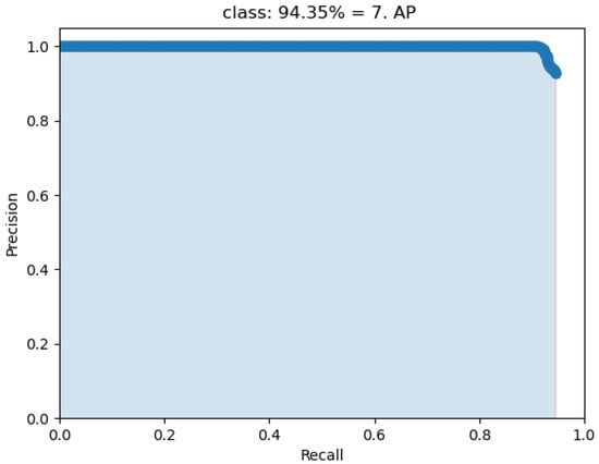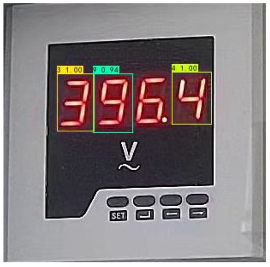 After the model training is completed, the precision, recall, mAP and F-Measure of each category are calculated in the verification set. The study found that the PR (Precision–Recall) curve of “7.” and its mAP, F-Measure is lowest, and the false detection rate of “9.” is high. The PR curve of “7.” is shown in Figure 10, and the PR curve of “7” is shown in Figure 11. The experimental results of each category are shown in Table 3. The experiment also found that the existence of the decimal point is enough to cause a missed detection when it is classified. Figure 12 is a schematic diagram of the missed detection.