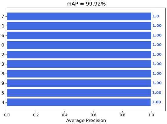 To reduce the YOLOv4 network parameters and reduce the mutual interference between categories, the digital panel data obtained in the first stage of detection is marked as 10 categories. If the numbers are the same, regardless of whether there is a decimal point, they are classified into the same category by numbers. The study found that by reducing the interference between the categories with a decimal point at the tail and the category without a decimal point at the tail, the accuracy, recall, average accuracy, and F-number have been significantly improved. The performance indicators of each category are shown in Table 4, and the average accuracy of each category is shown in Figure 13. Figure 14 is a schematic diagram of successfully detecting missing digital areas after joining the connected domain analysis module.
