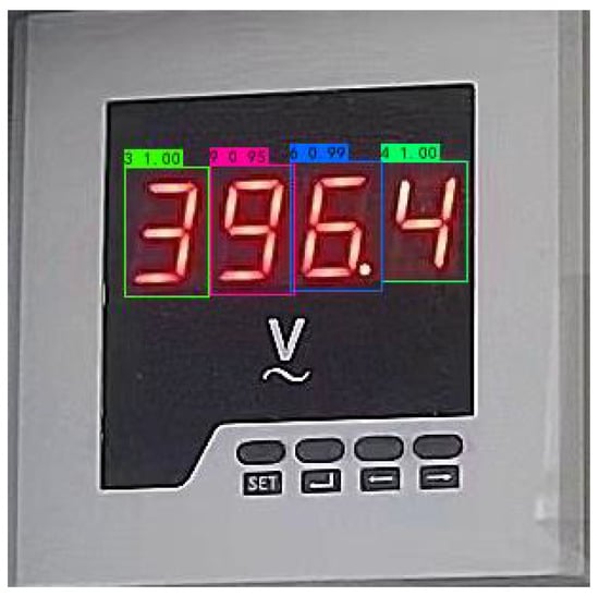 Combined with the YOLOv4 target detector of the connected domain analysis method, the detection targets in the input image are divided into 10 categories “0–9” by number. It can reduce the mutual interference between data categories, therefore improving the performance of the detector. Experiments show that the method increases the average accuracy of the YOLOv4 target detector from 98.29% to 99.92%, and all types of F-Measure are also increased to 1.00. The data shows that this method is suitable for the actual digital instrument data set of the substation. The experimental results of each category are shown in Table 4.