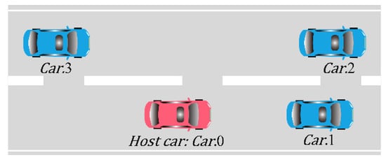In order to improve the above shortcomings, the automatic lane-changing decision-making based on game theory with Bézier curve path planning is proposed. This paper has made the following contributions to the automatic vehicle lane-changing system. (I) In this paper, the existing safety distance model is improved, and the key parameters of the model are optimized through the lane-changing data of the human driver. (II) Through a single-step dynamic game with incomplete information, the safety payoff, comfort payoff, and velocity payoff are taken into account for the lane-changing system and achieve the balance in the optimization. (III) The lane-changing time calculated by the path planning layer is taken as an important parameter to ensure the safety and comfort of lane-changing, which realizes the strong coupling of decision layer and planning layer. The proposed algorithm can better adapt to both discretionary lane change (DLC) and mandatory lane change (MLC). This paper mainly studies the typical expressway driving environments as shown in Figure 1, in which Car.0 is the host car, Car.1 is the front car in the current lane, Car.2 is the front car in the target lane, and Car.3 is the rear car in the target lane.