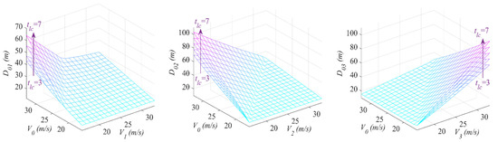 Figure 14a indicates that starts to slow down gradually after starts to change its lanes to guarantee a safety distance between different cars. Under the same deceleration with braking, the different lane-changing starting time of each driver leads to final different car-following distances of . In the same way, if the car-following distance is kept constant and the lane-changing starts later, requires greater deceleration with braking. Therefore, starting lane-changing operation early has smaller impact on other vehicles in traffic environment built in Case II.
