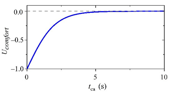 where is half of the total lane-changing time shown in (14). The big speed difference between the preceding car and the host car will cause a small , and the time reserved for the driver to change the lanes is also very short. That is, the big lateral acceleration will be generated during lane-changing, leading to the worse comfort of passengers. The changing trend of is shown in Figure 4. It is indicated that when is more than 2.5 s, the change of is relatively gentle, while when is less than 2.5 s, the comfort payoff decreases sharply, which is consistent with the collected average lane-changing time of human drivers. The change trend of meets the influence rule of lane-changing time on lateral comfort.
