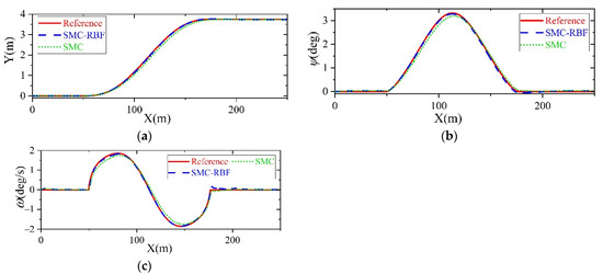 In order to verify the effectiveness of the proposed tracking control method, the lane-changing path tracking results of SMC and SMC-RBF are compared in MIL simulation environment. The vehicle speed is 25 m/s, the total lane changing time is 5.1 s, and the simulation time is 10 s. The results are compared in Figure 8.