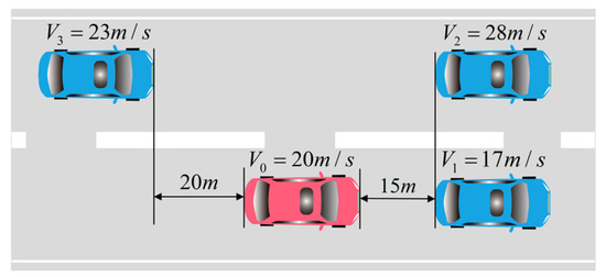 Left lane-changing and right lane-changing often occur in the real driving process, and the steering characteristics of left lane-changing and right lane-changing are similar [32]. On the basis of the specific left lane-changing scene, the specific analyses of the safety distance between and other cars are carried out as follows.