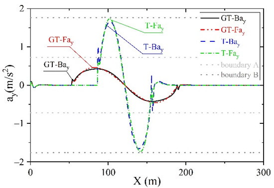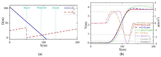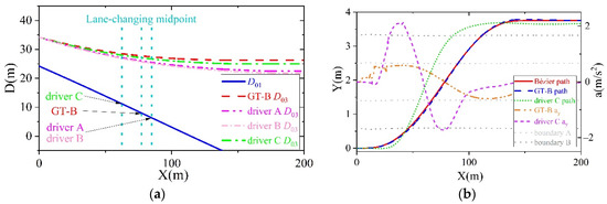 The lane-changing time of driver C is close to the lane-changing time under GT-B control, so driver C and GT-B are selected for comparison shown in Figure 14. It can be seen that at the lane-changing midpoint, the distance between under the control of GT-B and is relatively close. Although there is no collision, it may have negative impact on the psychology of the passengers in . Table 8 shows that the time from beginning to midpoint is less than the time from midpoint to finish by human drivers, and human drivers may be more accustomed to cutting into the target lane and then overtaking, rather than overtaking during lane-changing. However, under dangerous situations, overtaking during lane-changing is obviously a benefit choice for both vehicle safety and passenger comfort. Figure 14b shows that the lateral acceleration of the vehicle driven by driver C has exceeded boundary B and reached 2.1240 m/s2. Under the control of GT-B, the lateral acceleration of during lane-changing is still within boundary A, and its maximum value is only 0.6055 m/s2, which is decreased by 71.49% than that by driver C.