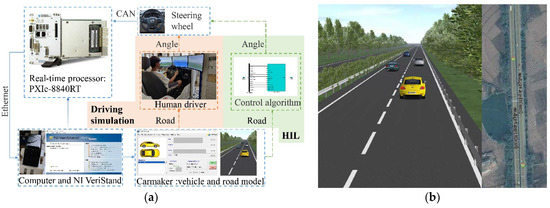 Experimental equipment framework and road modeling. (a) Driving simulation and HIL implementation. (b) Hefei-Xuzhou Section of G3 Jingtai Expressway in China in Carmaker.