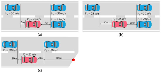 HIL traffic environment settings. (a) Traffic environment Case I. (b) Traffic environment Case II. (c) Traffic environment Case III.