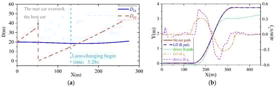 The vehicle path of driver B is compared with GT-B and shown in Figure 13b. The traffic setting in Case I is no risk of collision when lane is changed in the current scene, so GT-B chooses a longer lane-changing time, thus reducing the maximum lateral acceleration. In Figure 13b, the maximum lateral acceleration of the vehicle under the control of GT-B is only 0.32 m/s2, which is decreased by 36% than the maximum lateral acceleration of driver B of 0.5 m/s2 in the simulation, so that the comfort of passengers is improved.
