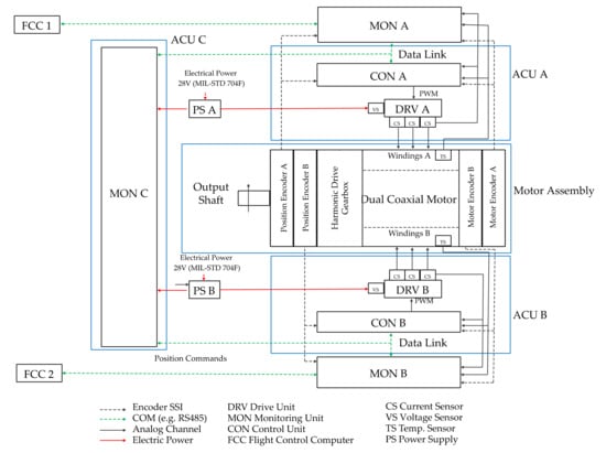 The outstanding reliability of the manned aircraft is preserved, compared to other transportation systems, thanks to strict certification requirements. On the other side, the average loss rate of unmanned aerial vehicles (UAVs) is currently 10 times worse than the manned category []. The fast growth of civilian applications of UAVs encourages civil aviation authorities to set airworthiness certification requirements for heavy UAVs similar to the manned category []. Here, the focus is for flight control electro-mechanical actuators (EMAs) that may be within safety-critical onboard systems depending on aircraft design. For specific flight controls layout, e.g., helicopters, the EMA function must not be interrupted after the first failure []. In order to satisfy such requirements, fault-tolerant architectures for EMAs are being developed in terms of hardware redundancies, e.g., multiple electric motors, in addition to health monitoring functions for managing fault-tolerant capabilities [,]. Evaluating possible hardware redundancies for flight control EMAs has been published in a follow-up study [], and the selected fault-tolerant architecture is presented in this paper with a comprehensive design for health-monitoring functions.