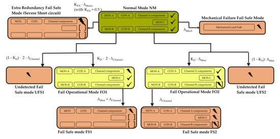 Entering Fail Operational Modes (FO1 and FO2) is triggered in case of a failure occurs in one or both channels. The respective failure rates are λChannel and λMon. Each channel contains its independent components (controller (CON), Monitoring Unit (MON), windings, power electronics, etc.). For the first failure, the fault detection rate KD quantifies the ability of fault detection. In the case of failed detection, represented by 1-KD, the transition to the Fail Safe Mode (UFS1 and UFS2) is assumed to be performed on a UAV level. Modes FS1 and FS2 are triggered if a consecutive failure is detected during the Fail Operational Modes. Any relevant mechanical failure occurring with the failure rate λMech is presumed to immediately trigger the Fail Safe Mode. In addition, a common cause of electrical failure could jeopardize the redundant concept. If detected, this also activates the Fail Safe Mode. However, as quantifying these effects requires in-depth field data, we estimate the common cause rate to be λCC,electric = 0.5 λMotor, with λMotor representing the failure rate of the electric motor.