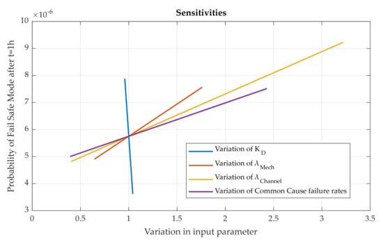 The chart illustrates that the channel failure rate is subject to the highest uncertainties since this parameter is influenced by a variety of components. Any component within one channel subject to an increased risk of failure (e.g., due to manufacturing, uncertainty in development and testing, etc.) influences the overall failure probability to a high extent. This result stresses the requirement for high-quality aerospace components to be used coupled with an appropriate level of design assurance. λMech and the common cause failure rate have similar effects on the overall reliability. A major impact is caused by the fault detection rate KD (reference is KD = 0.96). It presents the highest gradient and an increase to 0.98 could bring the actuator to the level of certification (5 × 10−6 1/h), emphasizing the importance of a well-proven health monitoring system (see Section 4).