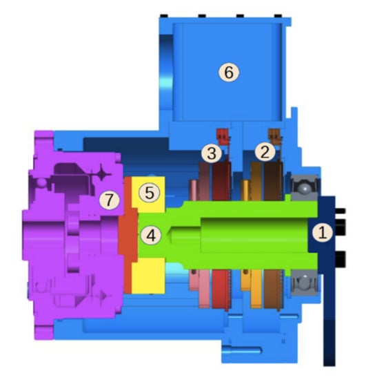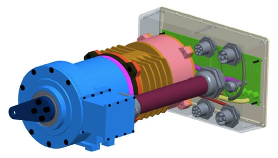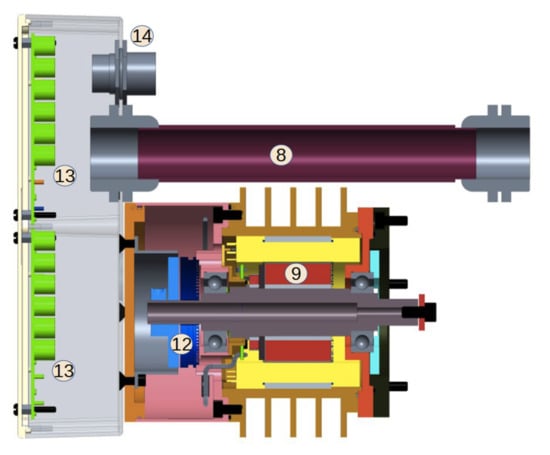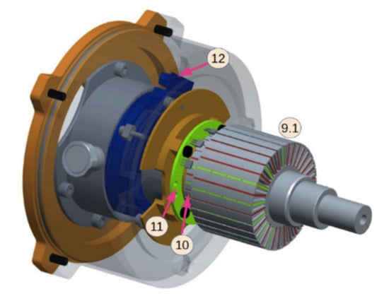 Another design concept is shown in Figure 11. Digital hall sensors are utilized for estimating the motor currents (ID 10, 11) in order to increase the robustness and compactness of the motor design. To assure a robust failure concept, integration of the hall sensors in close contact with the stator windings, as usually implemented, is not recommended. The maximum temperature of such sensors is usually smaller, and sensors are more prone to become damaged in comparison to the windings, which have a high maximum hotspot temperature. The hall sensors are therefore placed above an auxiliary rotor, which allows a thermal decoupling of the stator winding and the hall sensors, allowing them to be easily maintained. An implementation of the sensors within the stator slots would also decrease the winding slot factor and hence the total mass.
