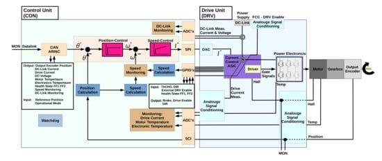 As shown in Figure 1 and Figure 14, each of the lanes A and B includes a drive unit (DRV) and a control unit (CON), together forming the actuator control unit (ACU). The main purpose of the ACU is to control the motor currents in such a way that the output lever follows a commanded reference position given by the FCC and to provide monitoring data for the MONs. Both the DRV and the CON are located on one ACU circuit board, which is shown in Figure 13. The CON mainly represents a safety microcontroller, and the DRV consists of electronic components, including the power MOSFETs of the half bridges which are connected to the motor terminals. Generally, the electronic and software architecture must be as simple as possible to reduce the number of possible failures within the system. Additionally, the source code of the CON unit for the communication and motor control must be as simple and robust as possible.
