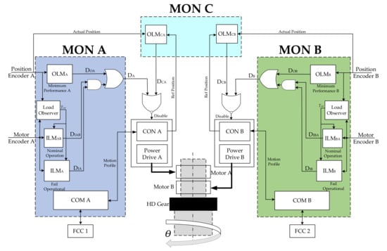 For MON C, there are only two OLMs, i.e., OLMCA and OLMCB, that are based on the position encoder of Lane A and Lane B, respectively. The objective of MON C is to monitor the position-tracking performance of the whole actuator because it is a high-level operational requirement. In addition, MON C performs a self-monitoring function for both MON A and MON B for possible wrong commands or their total loss of functions. Both OLMCA and OLMCB receive the actual position directly from local lane encoders. The position reference signal is obtained from direct links to local controllers, as shown in Figure 15. For example, if MON A is defective, i.e., DA cannot be activated, OLMCA will still be operative, and it provides a diagnosis decision to switch off Lane A (the control and drive unit of Lane A) by DCA instead of DA. A full allocation of the system faults due to a loss of a sensor or a processing unit is listed in Table 7.