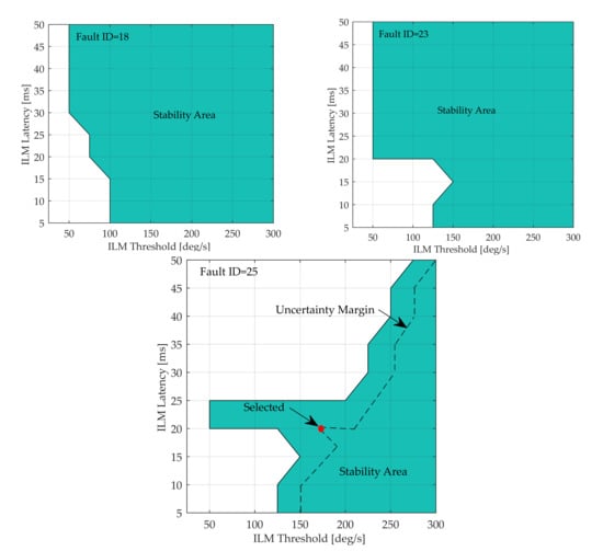 The first map (Figure 18) is for ILM functions, and it is the same for all ILMs: ILMA, ILMAB, ILMB and ILMBA. On the left side, possible ILM pairs, i.e., threshold and fault latency, to achieve stable control are highlighted by shaded area for fault ID = 18 or 19, which is a loss of a controller. On the right side, stable ILM pairs are for a loss of the position encoders, i.e., fault ID = 23 or 24. On the bottom side, stable ILM pairs are for a loss of the motor encoders, i.e., fault ID = 25 or 26, where the stability area is more constrained compared to fault ID = 18 or 19. The optimum selection of ILM pairs should consider an uncertainty margin to account for the operational transients and simulation approximations. This margin is realized by a threshold level of 160 deg/s and a latency of 20 ms.