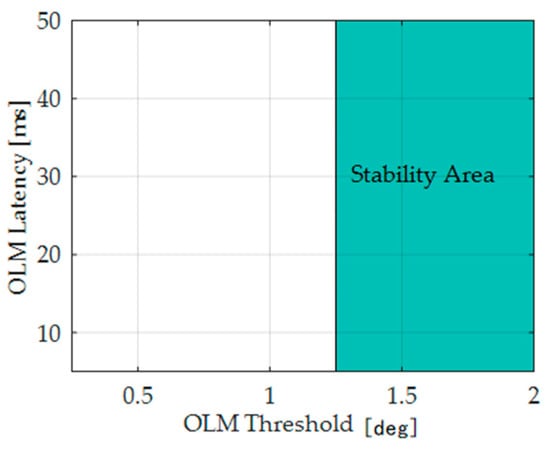 The second map (Figure 19) is for OLM functions. For controlling critical faults, the control stability is only influenced by the OLM threshold. Similar to ILM, an uncertainty margin for OLM parameters involve the OLM threshold of 1.5 deg and the same latency of ILM of 20 ms. Parameters for OLMs and ILMs are listed in Table 11.