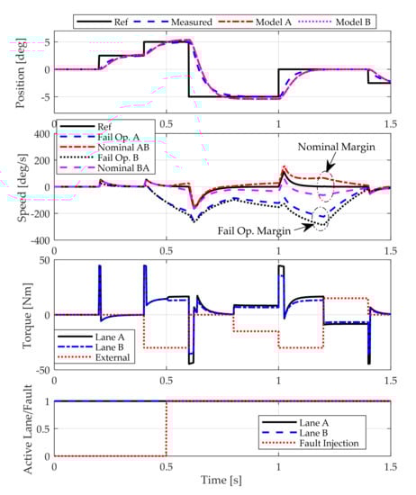 In this method, the faults are modeled by dynamic changes of actuator parameters, e.g., a reduced armature resistance for a short circuit and a reduced magnetic flux parameter for the magnet flux degradation. This method is simple and easy to be executed for some faults. However, there are two significant limitations related to its sensitivity. It is negatively influenced by model uncertainties and dynamic approximations. In addition, it is hard to be evaluated by performance requirements. For example, a 10% reduction in the armature resistance cannot be directly converted to a specific system requirement, e.g., the corresponding power deficiency. Excessive friction faults are considered by the viscus friction parameter of the gear (parameter-based fault injection), which is a common element for both lanes.