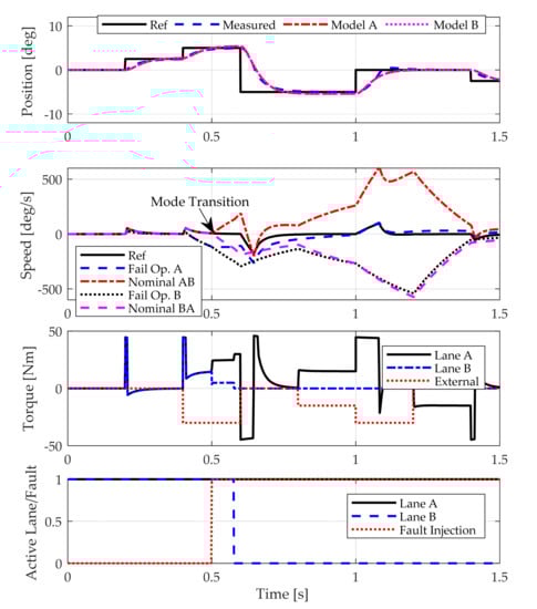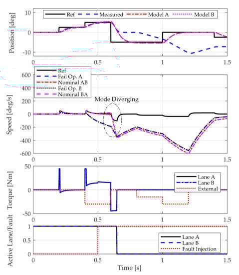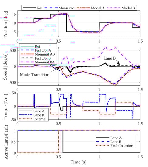 Fault detection and reconfiguration functions have been evaluated for 30 health conditions listed in Table 3. Four detailed case studies will be discussed in this section, in addition to the overall performance for all conditions in Table 3. The first case study is for fault ID = 2, where a 20% drag torque (20% of the electric torque) is applied to Lane B after 0.5 s. As shown in Figure 20, there are no significant errors for both position and speed tracking performance for the actuator after injecting the fault. The reference speed is bounded within the predicted nominal levels that are estimated by ILMAB (Nominal AB) and ILMBA (Nominal BA). The largest nominal margin occurred at 1.2 s, where the external load direction is altered at no movement. Fail-operational A and B indicate the predicted health status by ILMA and ILMB, respectively.