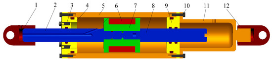 Schematic diagram of MR damper. (1) Left lifting lug, (2) left piston rod, (3) injection hole screw, (4) left end cover, (5) cylinder, (6) excitation coil, (7) piston head, (8) right piston rod, (9) right end cover, (10) end cover screw, (11) end shield, (12) right lifting lug.
