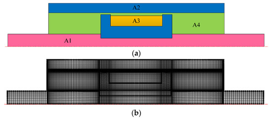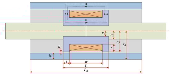 The performance of an MR damper is related to its internal electromagnetic field, flow field distribution and damper structure. To explore the distribution and change laws of the internal electromagnetic field and flow field of the proposed damper when it is energized, and thus obtain the dynamic performance of the damper under the action of multiphysics coupling, a simulation model, as shown in Figure 4, was established by COMSOL software (Version 5.4) according to the structural parameters in Table 1. Considering that the proposed damper is a regular axisymmetric body about the central axis, to simplify the calculation, the model dimension is set to two-dimensional axisymmetric [30], and the 1/2 section of the damper is taken as the simulation object without affecting the accuracy.