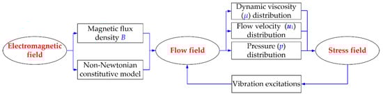 Figure 3 shows the coupling relationship between the physical fields of the MR damper. For the magneto–fluid coupling process, the effect of the electromagnetic field on the internal flow field of the damper is more prominent. In contrast, the effect of the flow field on the electromagnetic field is relatively small so that it can be regarded as a unidirectional coupling effect. In the whole process of magneto–fluid–solid coupling analysis, the movement of the damper causes the flow state of the MR fluid to change, and the load of the fluid reacts on the damper to produce stress and strain in the structure.