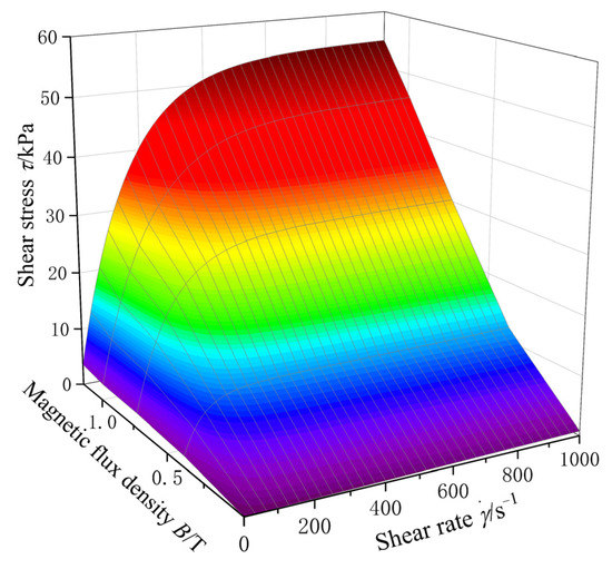 As a kind of non-Newtonian fluid whose viscosity varies with magnetic flux density and shear rate, the rheological properties of the MR fluid are the critical medium for coupling the magnetic field and flow field in the damper. According to the test data provided by the material supplier and based on the Bingham–Papanastasiou model of non-Newtonian fluids, the optimal theory and ordinary least squares were adopted to identify the original data, and the characteristic surface of MRF-J25T was obtained, as shown in Figure 5. Its mathematical expression is: