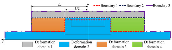 In order to dynamically simulate the process of the vibration of the damper, the arbitrary Lagrangian–Euler (ALE) method was used to process the dynamic mesh of the simulation model, and the motion equation specifies the displacement state of the piston. The simulation model can be divided into four deformation domains according to the motion form of the piston, as shown in Figure 6. Three simulation boundaries were defined; boundaries 1 and 2 are the fluid–solid coupling boundary and boundary 3 is the electromagnetic field boundary. The moving wall condition consistent with the piston motion equation was applied to boundary 1. The non-sliding fixed wall condition was applied to boundary 2, and the magnetic field parallel condition was applied to boundary 3.
