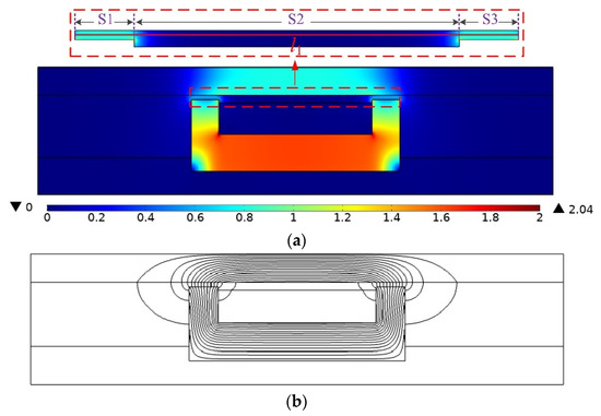 In the magnetic field simulation, the electromagnetic field simulation of the damper is treated as a two-dimensional static magnetic field problem without considering the transient process of excitation current and the weak eddy current generated when the piston moves. Only the state of its internal stable magnetic field was analyzed. The current density was applied to the excitation coil area according to Equation (19). The distribution of the electromagnetic field inside the proposed damper when the given current was 1 A is shown in Figure 7. According to the distribution of the magnetic field, the damping gap can be divided into three sections, S1, S2, and S3. The sections S1 and S3 are where the magnetic flux lines are concentrated, so these two sections were called effective damping gaps. It can be seen in Figure 7a that the distribution of the magnetic field in the damping gap was not uniform. The magnetic flux density at the two effective damping gaps was relatively large, while the magnetic flux density at the S2 section was close to zero. As shown in Figure 7b, the magnetic flux lines in the damper passed through the piston head and cylinder to form a closed loop, the direction of which was consistent with expectations, based on the theoretical analysis of the magnetic circuit. Most of the magnetic flux lines passed through the effective damping gaps S1 and S3 vertically, with only a slight magnetic flux leakage phenomenon, which fully utilizes the electromagnetic field performance.