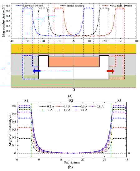 Distribution of magnetic flux density along the path. (a) Different positions of the damper piston, (b) different excitation currents.