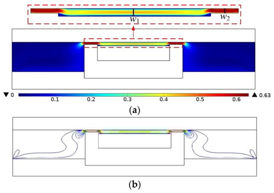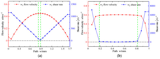 To analyze the flow state of the MR fluid at different positions of the damping gap when the damper is energized, two observation paths w1 and w2 were defined in the gap as shown in Figure 9a, where w1 and w2 are in the center of channels S2 and S3. According to Figure 8b, the magnetic flux density at path w2 is the maximum value in the damping gap, and the magnetic flux density at path w1 tends to zero. The flow velocity and shear rate of the MR fluid were observed along the two paths, and the results are shown in Figure 10. As can be seen from Figure 10a, the velocity of the MR fluid at path w1 presents a parabolic distribution, which is the same as that of a Newtonian fluid. The velocity reaches a maximum in the middle and tends to zero at both ends. As can be seen from Figure 10b, the MR fluid flows in the plunger mode at path w2, and the velocity in most of the middle section is almost the same. The area where the fluid shear rate is close to zero is called the plunger area. Comparing the two figures, it can be seen that the plunger area where the MR fluid flows at path w2 is much broader than that at path w1. The large magnetic flux density causes the rheological effect of the MR fluid under the action of a magnetic field, and its viscosity and shear yield stress will increase sharply, resulting in the broader flow plunger area. The magnetic flux density at path w1 tends to zero, where the MR fluid appears as a Newtonian fluid state with minimal viscosity and yield stress. Hence, its flow plunger area is very narrow.