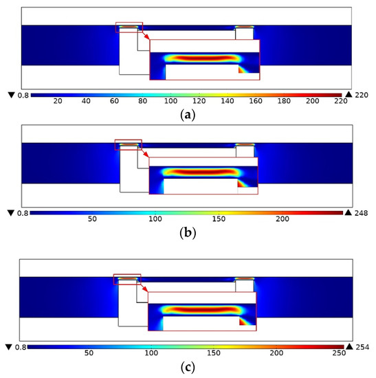Dynamic viscosity distribution under different currents. (a) Current of 0.6 A, (b) current of 1 A, (c) current of 1.4 A.