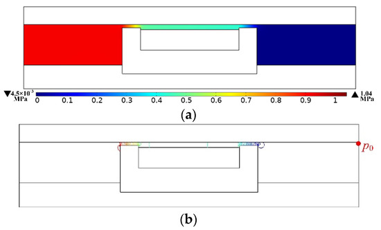 Point p0 on the right boundary of the damper chamber was selected as the pressure reference, that is, the pressure at point p0 was set to zero. The initial position of the pressure distribution in the damper is shown in Figure 12 when the given excitation current was 1.0 A. Figure 12a is a cloud chart of pressure distribution. The pressure distribution in the left and right chambers is relatively uniform, there is a significant pressure difference between the two chambers, and the pressure change gradient along the damping channel is large. Because in the initial position, the piston head will stretch to the left to compress the left chamber, forcing the MR fluid to flow from the left chamber to the right chamber through the damping gap. The MR fluid flowing through the gap will produce a large magnetically induced pressure drop under the magnetic field, resulting in a large pressure difference between the two chambers.