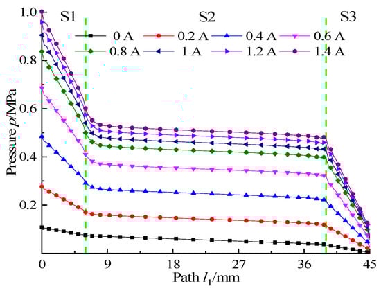 To analyze the influence of the excitation current on the pressure drop of the MR fluid flowing in the damping gap, we observed the pressure distribution in the gap under different currents along the path l1. The results are shown in Figure 13. It can be seen from the figure that the pressure along the path of the damping gaps S1 and S3 has a large gradient, and its variation range increases with the increase in the excitation current. The pressure at the S2 section has a minor change gradient along the path. The pressure distribution curves under different currents are almost parallel at the S2 section, and the magnitude of the change hardly changes with the current. The damping gap’s S1 and S3 sections have strong magnetic flux density, which will increase with an increase in the excitation current, while the magnetic flux density at the damping gap S2 approaches zero under each current. The strength of the rheological effect of the MR fluid is related to the strength of the magnetic field. The distribution and change of the magnetic field in the gap will eventually result in the pressure distribution along the path as shown in the figure.